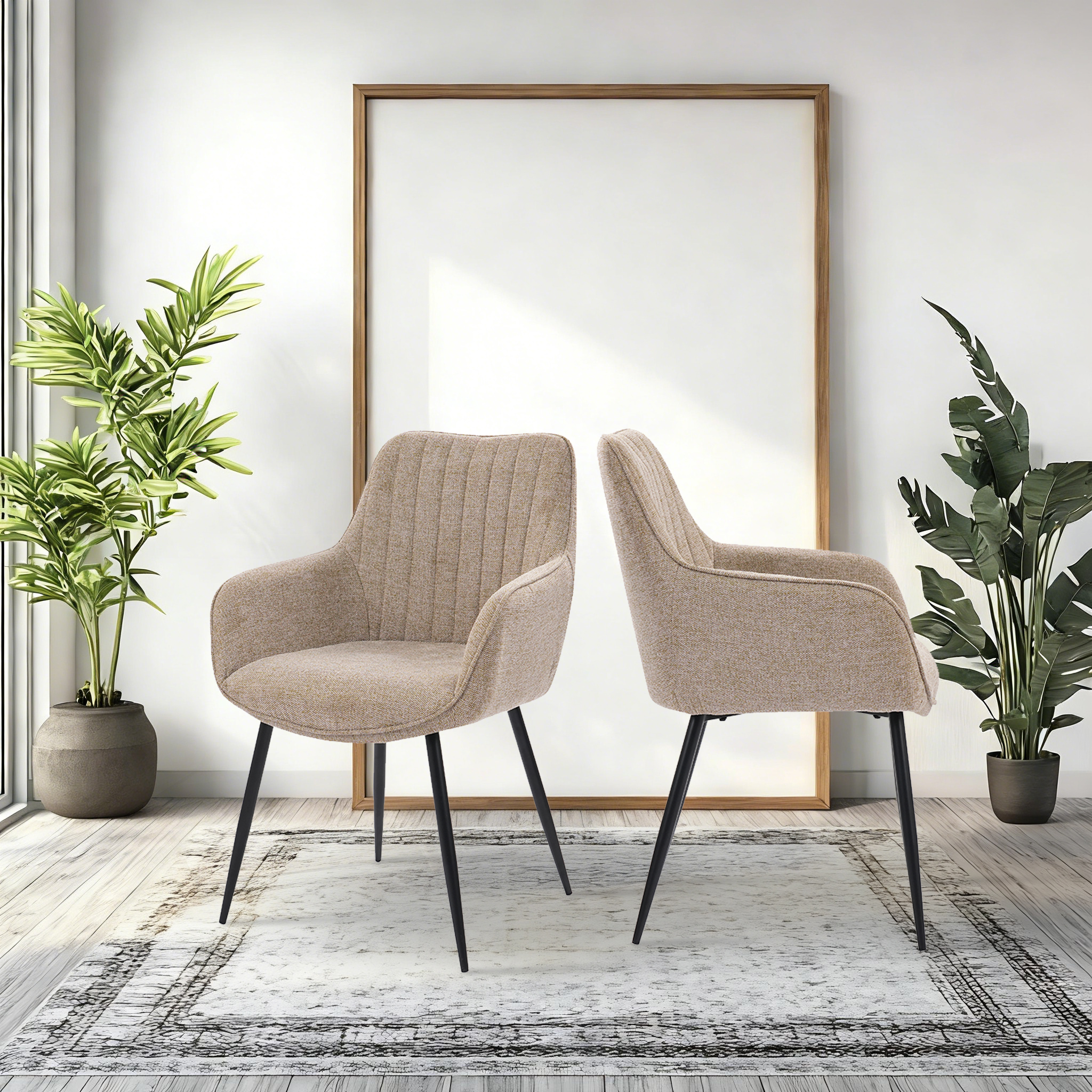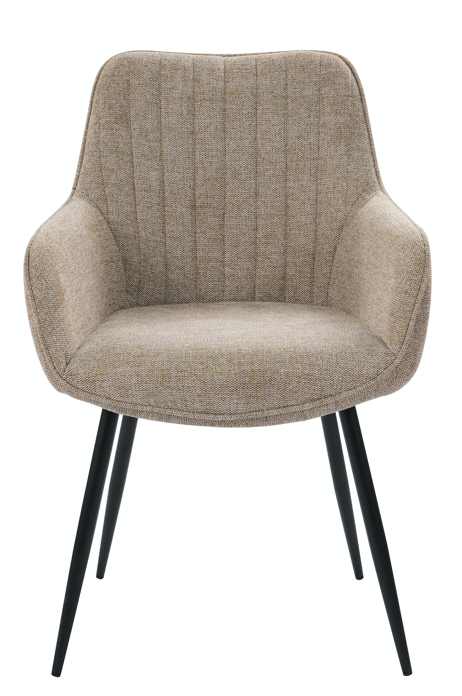 Dieser Esszimmerstuhl mit Armlehnen bietet hohen Sitzkomfort für den täglichen Gebrauch. Die Schaumstoffpolsterung mit einer Stärke von 110,5 mm sorgt für ein angenehmes Sitzgefühl. Die stabile Sitzbasis aus Holzwerkstoff in Kombination mit schwarzen Metallbeinen gewährleistet einen sicheren Stand und eine Belastbarkeit von bis zu 120 kg. Der Stoffbezug ist in Beige erhältlich und lässt sich vielseitig kombinieren.